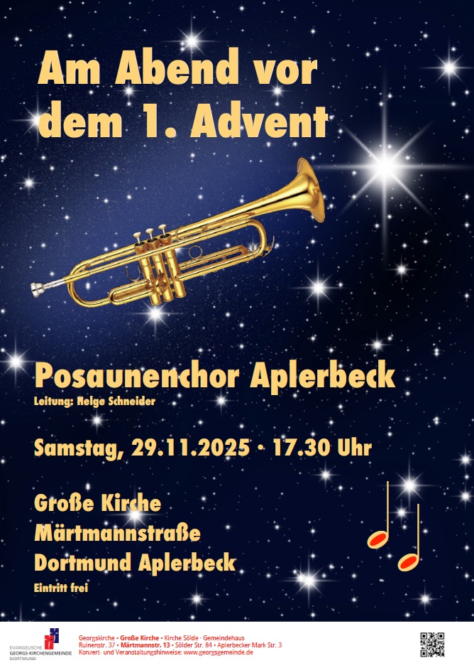 Die Bläserinnen und Bläser des Posaunenchores Aplerbeck präsentieren ein vielfältiges Programm aus Bläsermusiken mehrerer Epochen und unterschiedlicher Stilrichtungen. Auch adventliche Lieder zum Mitsingen sollen Sie auf die kommende Adventszeit einstimmen.